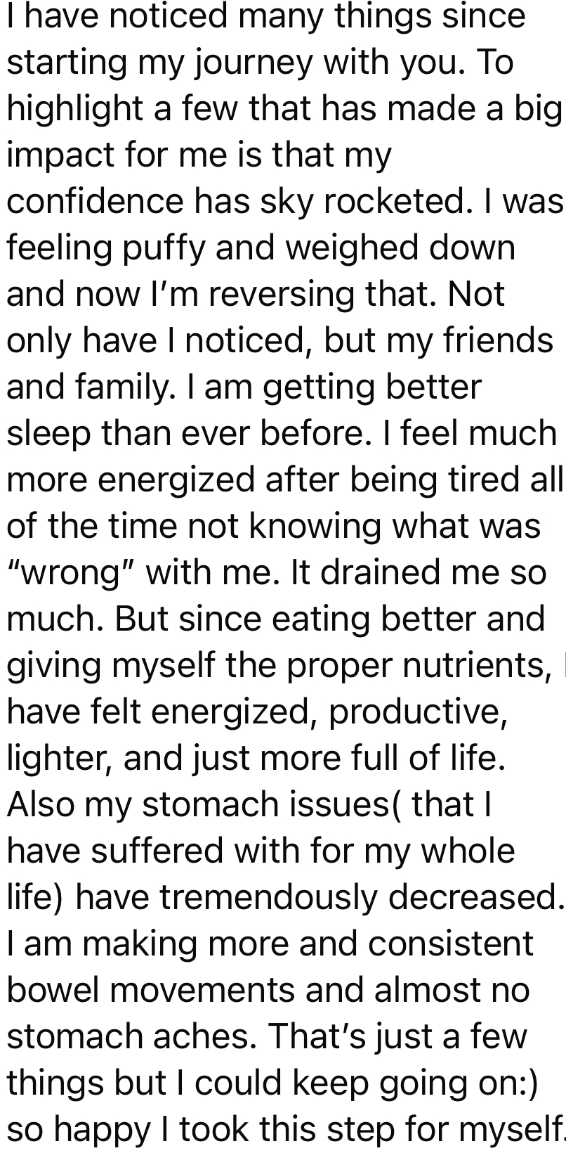 My clients achieve lasting change through personalized protocols that address the root causes, not just the symptoms. Every success story reflects the power of combining advanced lab insights with functional health coaching that’s designed around the individual.